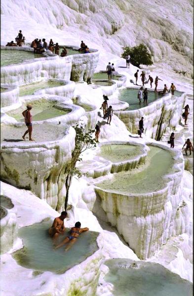 Way line, far more than ten kilometers outside, you can see the yellow ground Jingxian touch of white, like a glacier. When the profile has become increasingly clear, the eyes actually appeared as if a huge white castle. Yu-chieh, like the white lotus-like layers of terraced fields covered slopes along the mountain in the mound trickle gurgling down the Rocks. Platform at the water into a pond, a bark like a light blue spring water right into every white jade embedded in the table, a flower like a white stone steps of cotton Lingling dressed in clean water yarn shine in the sun. Outside the meantime, like a foot on the ladder of heaven, like a sleepwalking Yuyu King House of Jade Pool wonderland. This strange slope 2,700 meters long, 160 meters. Turks call it "wood Carlisle Pa", or "Cotton Castle."